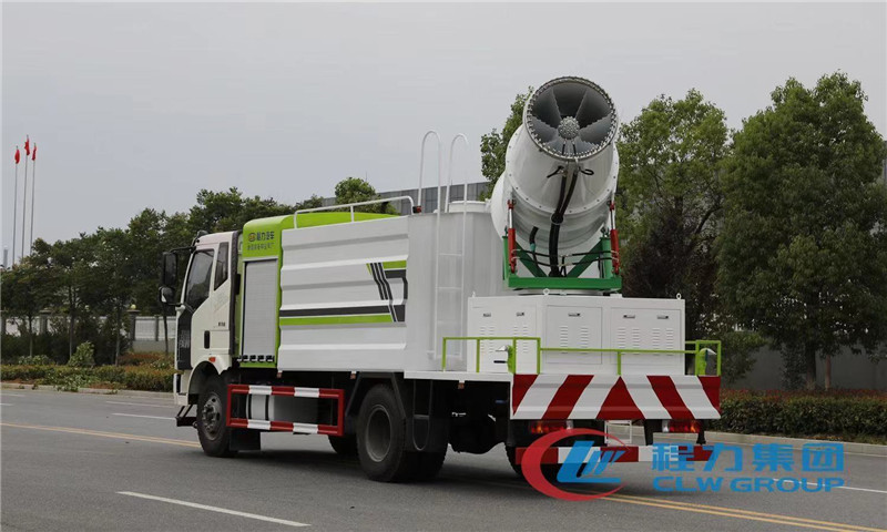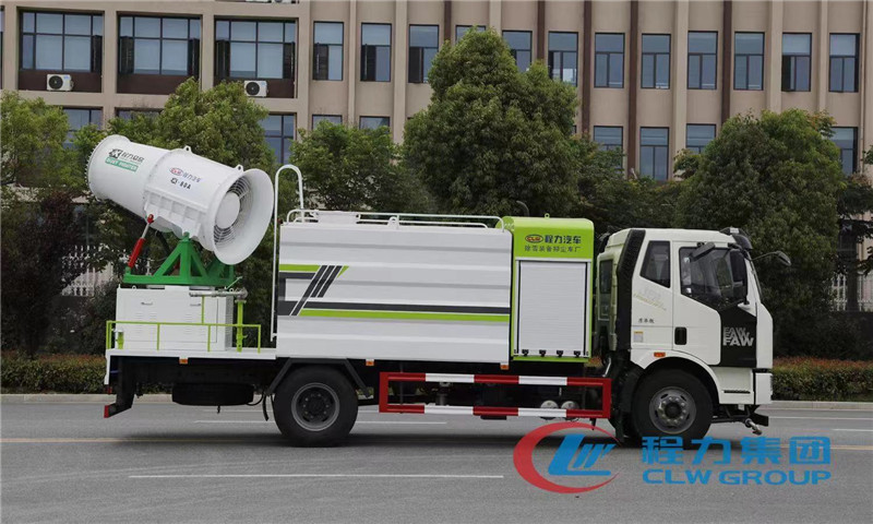 國六解放多功能抑塵車后工作平臺兩邊安裝的有后灑,可噴灑5米左右,主要用于空氣抑塵;平臺左邊安裝的有灑水炮,柱狀可噴灑35米,霧狀可噴灑5米左右,主要用于澆灌及抑塵。
