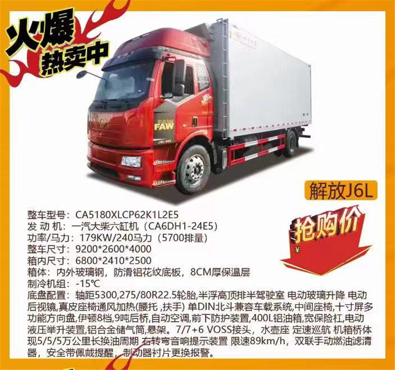 解放J6L冷藏車,廂體長度6.8米。