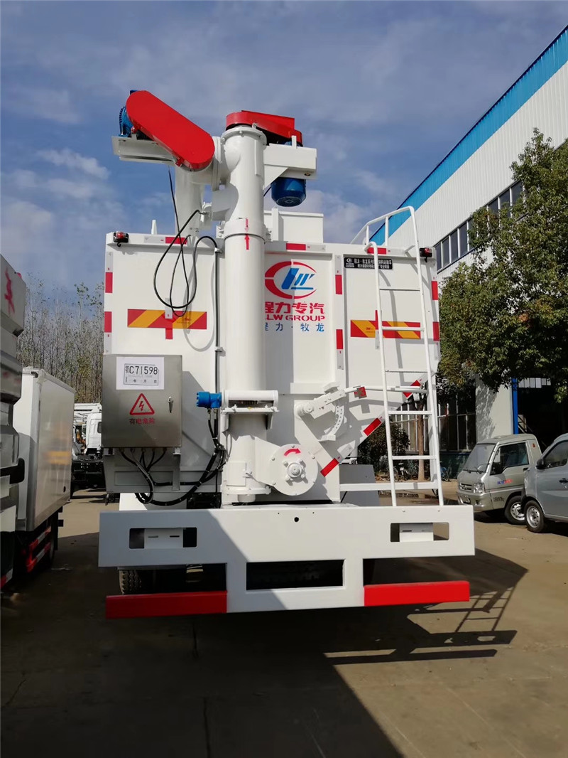 這款東風天龍散裝飼料運輸車主要用于飼料的運輸作用,主要專用裝置是飼料倉和上下料的絞龍機構。