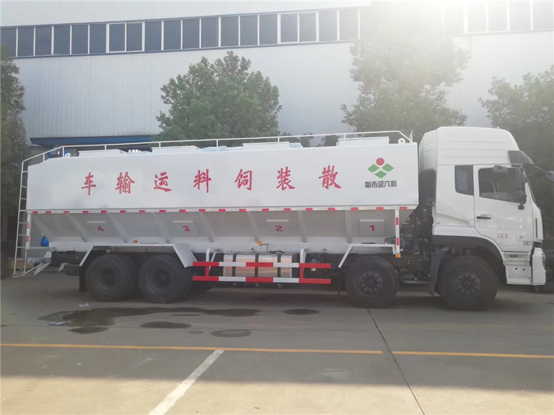 總結,這款東風天錦20方散裝飼料運輸車主要用于從飼料廠向畜牧場、養禽場及飼料加工用戶運輸散裝飼料成品或飼料生產原糧,同時它也可用來運輸某些無腐蝕性粉粒狀原料,如制藥廠粉料和糧庫周轉。