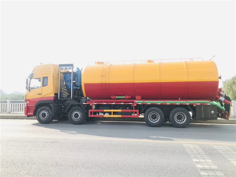 東風22噸高壓市政排水搶修吸污車是在高壓清洗車的基礎上加裝吸污泵、吸污罐、吸污管道等設施的集清洗和吸污兩種功能于一身的特種車輛,由兩個罐體、兩個泵(高壓清洗泵、真空吸污泵)、兩套管路系統等組成。