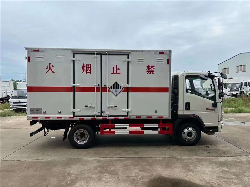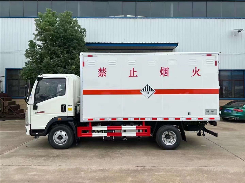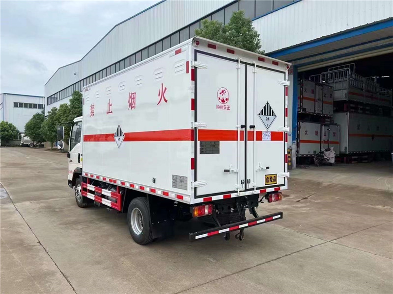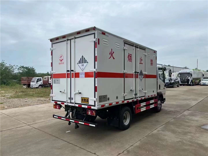 危化品運輸車常規貨廂尺寸 :4100X2100×2100,可滿足大尺寸需求客戶,可做瓦楞板結構,可選裝液壓尾板,總質量(kg) :7360,額定質量(kg):3480