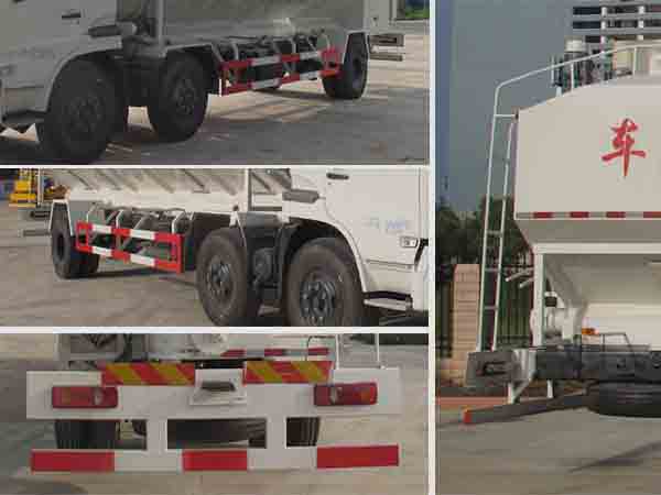 箱體采用國標鋼材制作,頂部是三個厚的防滑花紋板;飼料罐有效容積為30立方米,罐體分3個隔倉,每倉可單獨裝卸飼料,罐體長度約8.1米,輸送方式為電動(380V)絞龍卸料,整車顏色為白色,罐體采用冷扎鋼板焊接而成。可裝15-20噸,標配3倉,電動絞龍卸料,卸料管傾斜70度,垂直卸料高度8.5米,整車卸料完用時25分鐘。完全滿足養殖基地飼料塔的灌裝需要!