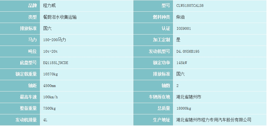 東風(fēng)多利卡D9餐廚垃圾車配置;發(fā)動(dòng)機(jī)可選配,康明斯195馬力,玉柴200馬力,軸距4500,駕駛室原裝空調(diào)、液壓翻轉(zhuǎn)、方向動(dòng)轉(zhuǎn)、斷氣剎、ABS、中控鎖鎖+電動(dòng)車窗+遙控、剎車自調(diào)臂、可調(diào)大燈、晝行燈,北斗雙模,氣囊座椅。