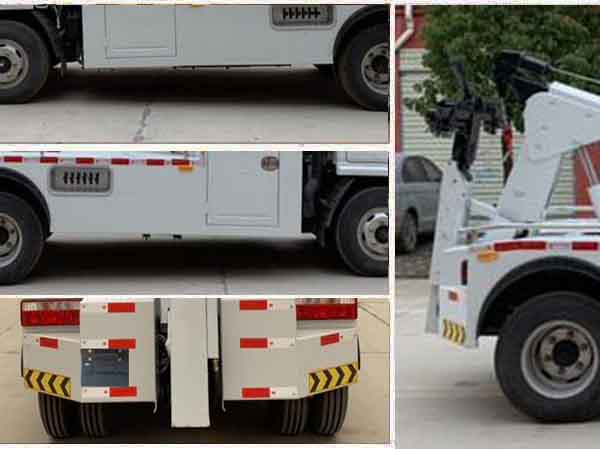 托舉質量:500kg.此車為道路清障專用車輛,專用裝置為拖臂.隨底盤選裝前面罩以及前霧燈.防護材料:Q235A,左右側面采用裙板結構,離地高為380mm.后下部防護為專用裝置拖臂代替,離地高為370mm.ABS廠家及型號:襄陽東風隆誠機械有限責任公司/ABS/ASR-12V-4S/4M.此車整車長/軸距/后懸對應關系為(mm):5350/3308,4992/2950,4742/2700.選裝手動抱胎裝置.