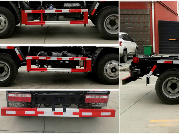 1、隨底盤選裝駕駛室。2、整車長度與軸距對應關系為(mm):4705/2700,4955/2950。3、防護材料:防護材料:Q235B碳鋼,連接方式:左右側面防護與副梁均采用焊接連接,后下部防護與車架采用焊接連接,后部防護斷面尺寸(mm):120×50,后部防護離地高度(mm):400。4、ABS型號/廠家:ABS/ASR-12V-4S/4M/襄陽東風隆誠機械有限責任公司;發動機與油耗值(L/100km)的對應關系為:D20TCIF1/11.4,YCY24140-60/11.4,CA4DB1-11E6/11.4,ZD30D16-6N/11.4,CY4BK461/11.4,CY4BK161/11.4。5、專用裝置:拉臂機構,主要用于城鎮環衛散裝生活垃圾的收集與運輸。