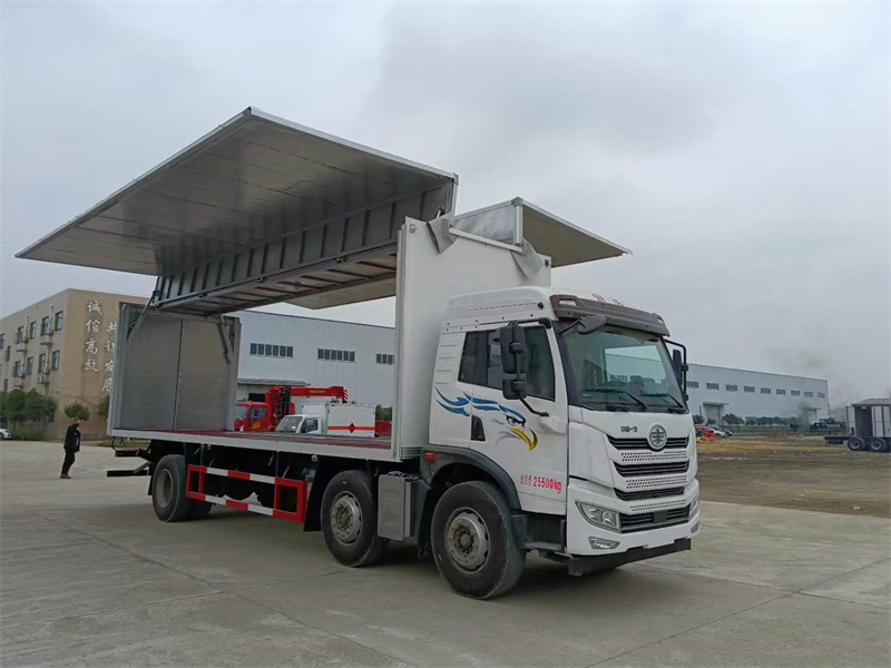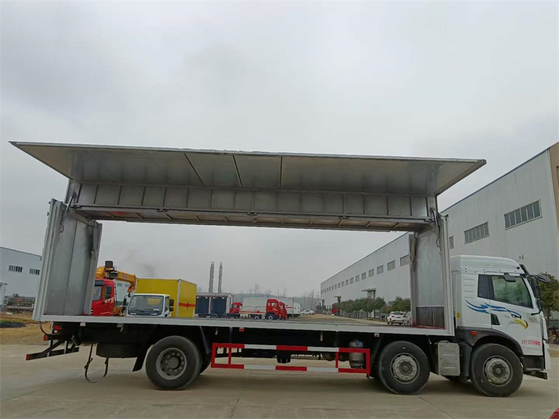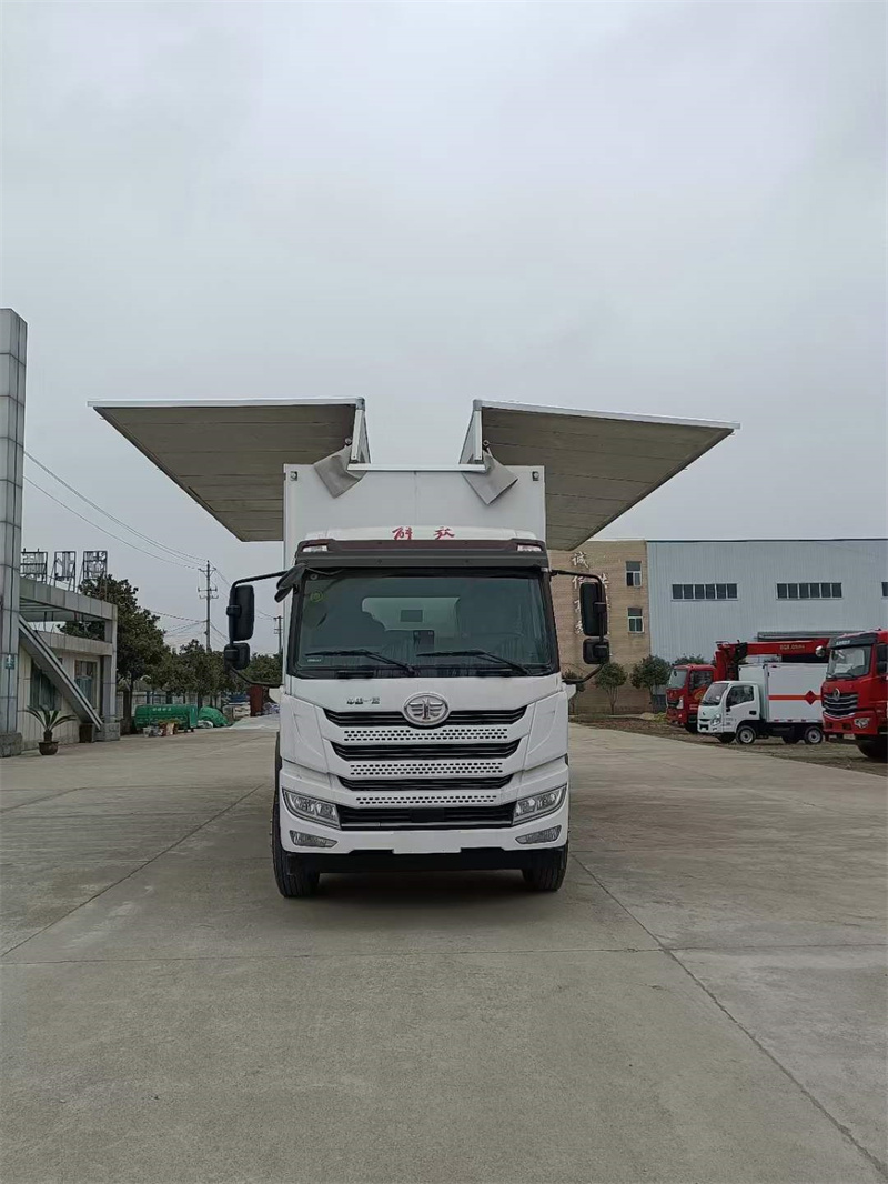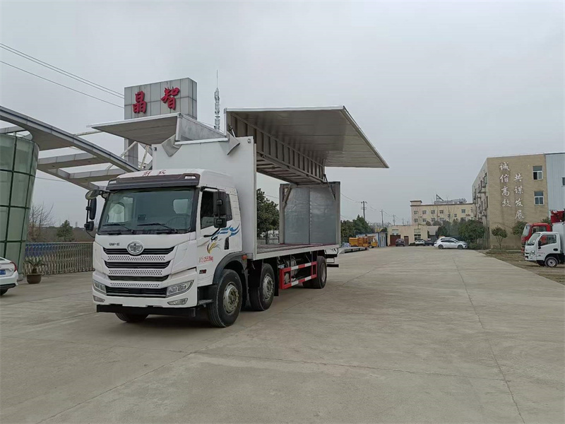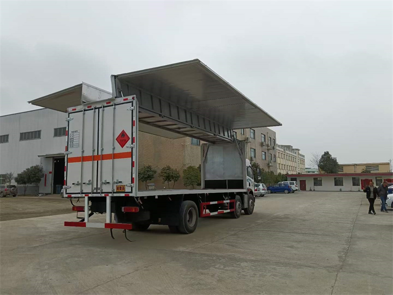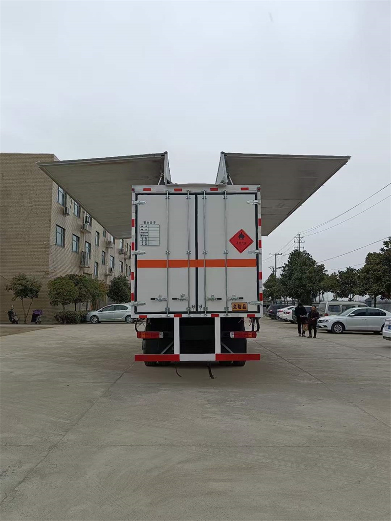 上裝配置:外板采用冷軋鋼板一次性沖壓成型的百葉窗,內飾為導電性能良好的鋁板有透氣孔,內襯為矩形管骨架牢靠穩定,骨架內部填充為透氣防潮阻燃的擠塑板。廂體外部四周鋁合金型材包邊,底板和車廂前下部鋪橡膠皮,后門雙開,右側選裝側開門,內部安裝固定貨物的臥環或腰欄,安裝煙霧報警器、防盜感應器。車身附件靜電接地帶、滅火器、防火罩、危險品三角燈、橙色反光帶、CCC反射器、菱形標志牌、危險品牌、安全告示齊全。