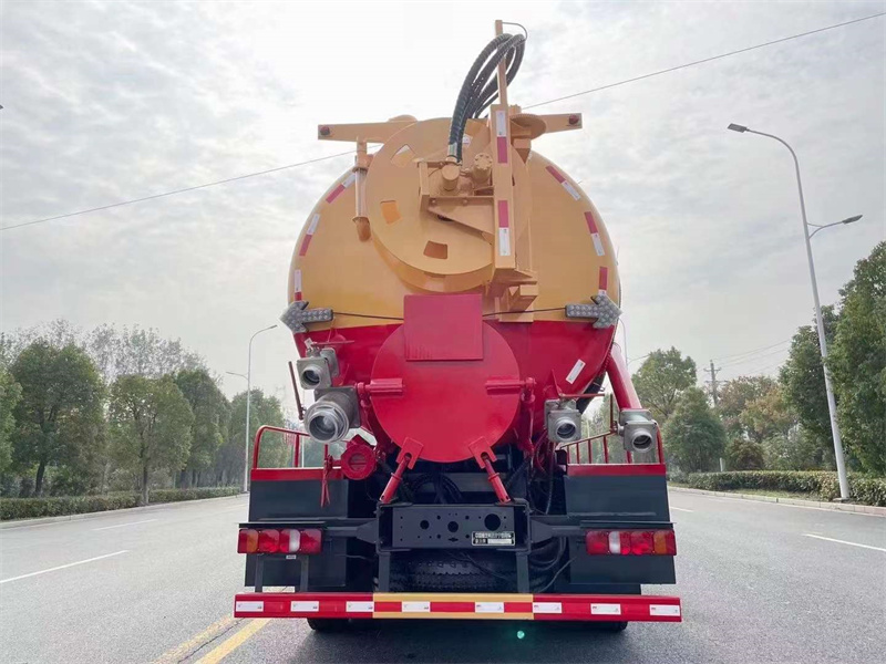 重汽豪沃后雙橋清洗吸污車罐體總?cè)莘e22立方,罐體材質(zhì)筒體8mm,前封頭6mm,水污間內(nèi)封頭及后封頭均為8mm厚武鋼產(chǎn)優(yōu)質(zhì)碳鋼板材制作,清水倉為6-8立方,余下留作污罐使用,污罐底部鋪焊1.2米寬不銹鋼底板,頂部兩側(cè)做有碳鋼防滑平臺護欄,污罐頂部裝有水泥罐口,清水罐頂部為水車罐口,水污互通,清水灌左右各裝洗手龍頭一個,清水罐、污罐各做不銹鋼爬梯一個,中置頂(帶液壓鎖緊裝置),清洗部分采用品孚330流量高壓泵,后封頭帶有可旋轉(zhuǎn)齒輪自動液壓絞盤,后封頭下部開700mm液壓排污口1個,后封頭左下為DN150排污閥1個,DN100排污閥一個,后封頭右下為DN100排污閥1個,右上為DN100吸污閥1個帶內(nèi)抽管,后尾側(cè)為DN100吸污閥,右后輪與工具箱間為DN150偷排口,1個工具箱,操作箱隔成上下兩層,加大加高防溢閥,后尾部裝雙箭頭燈,清水罐頂部裝排氣閥1個,清水罐底部裝DN100排水閥1個,頂部65水污互通球閥。罐體兩側(cè)平臺用優(yōu)質(zhì)碳鋼材質(zhì),罐體可液壓舉升,后蓋不液壓開啟,吸污車采用全新國三電噴430馬力副發(fā)動機配258水循環(huán)泵。